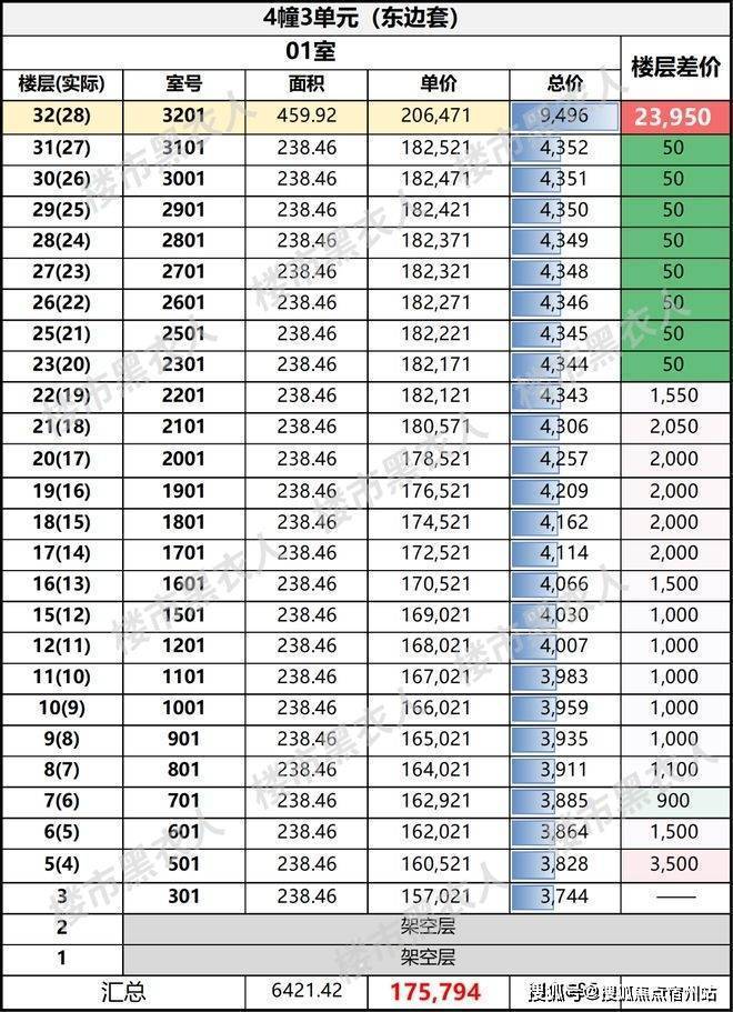 先看238㎡。这张表最值得注意的一点,就是高区价差被压得非常薄。23层和31层之间,楼层差价只有50元/㎡,因此造成总价差也仅有8.35万
