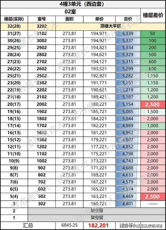真正的价格跳跃,反而集中在中低区往中高区跨越的那一下。比如238㎡从20层到21层,单价差要达到2500元/㎡。也就是说,西边套是在某几个关键舒适层、景观层上做了跳价,到了更高区以后,反而把价差压平。