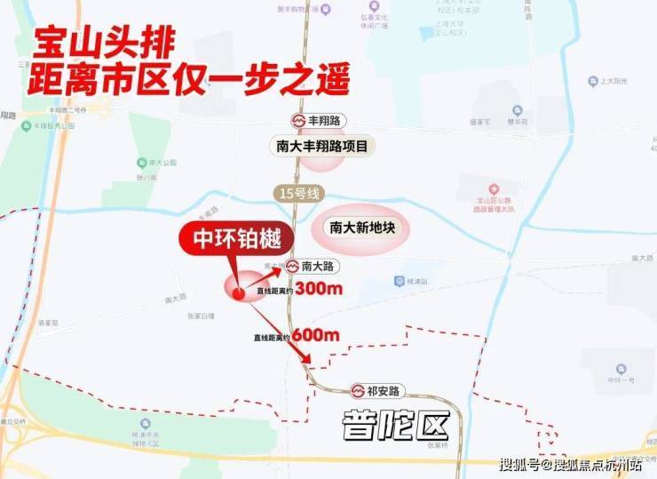 首先,中环铂樾是宝山头排,项目距离普陀直仅约600米,是整个南大乃至整个宝山距离市区最近的一个。