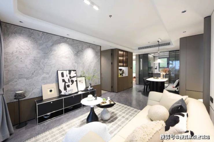 除了精装外,项目还有更多的品质感表现。例如客厅地面选用的是北京城建国誉府高定的温德姆灰大理石瓷砖;简一大尺寸瓷砖,拼缝仅0.35mm,工艺复杂,几乎无缝,整体性强