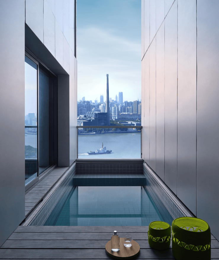 夜晚微风习习,躺在泳池之中,品一杯红酒,就可惬意俯瞰繁华上海滩。