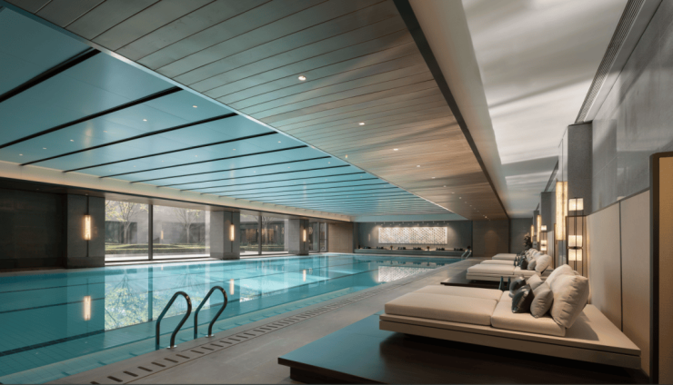 项目配备了只对业主开放的约2600㎡双首层地下会所。内部配置25*11m半标恒温泳池,泳池配设4条泳道,还有约180㎡私宴厅,酒窖、会客厅及健身房等功能。