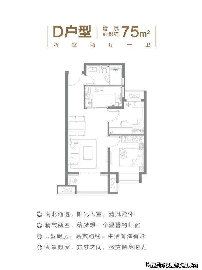 建面约75㎡2房户型,是目前少有的能以超低总价上车的户型。并且,双开间朝南+主卧带飘窗、客厅带宽面阳台的设计,保证了室内每个空间都能享受到惬意的阳光。