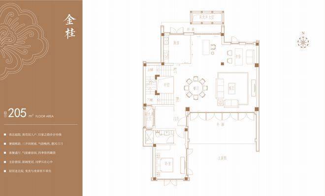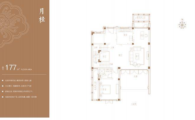 园内布局五进制南北主轴、以及“双龙戏水”格局的双水街,巷道联通,设七大景观组团,形成“一环、两轴、七境”布局。175席中式园宅,依巷分布南北,横平竖直,秩序井然。