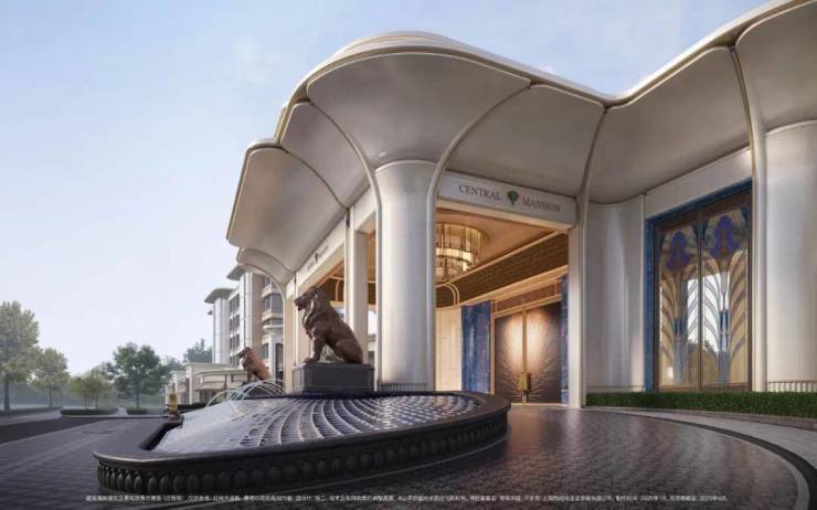 「玉兰门庭」摩登飘逸,环抱式落客前场,大师定制非遗掐丝珐琅门钹,流转温润光华,敬呈归家尊崇礼序,自此启幕生活的华贵序章。