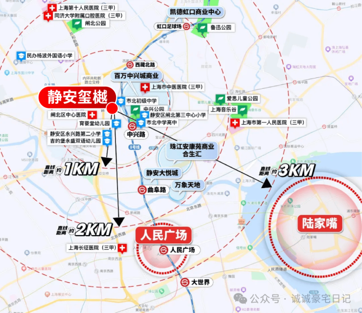 商业方面,项目1公里范围内有静安大悦城、万象天地、凯德虹口商业中心、百万中兴城商业(在建中)、珠江安康苑的商业合生汇(在建中)等大型商场。