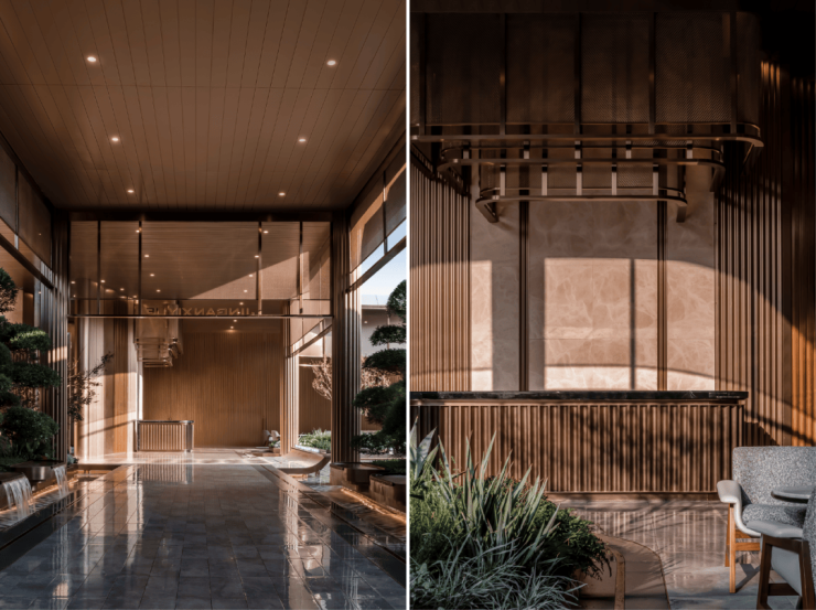 外立面方面,项目采用石材、真石漆,铺以横向铝板线条,通过对材质细部的精细化设计,真实还原海派立面的摩登风格。
