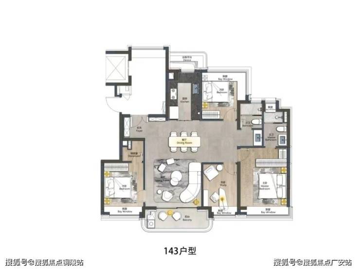 四开间朝南的设计+六飘窗(北次卧约270°转角飘窗)+宽面阳台,整个户型的采光通透度真的做到了完美。