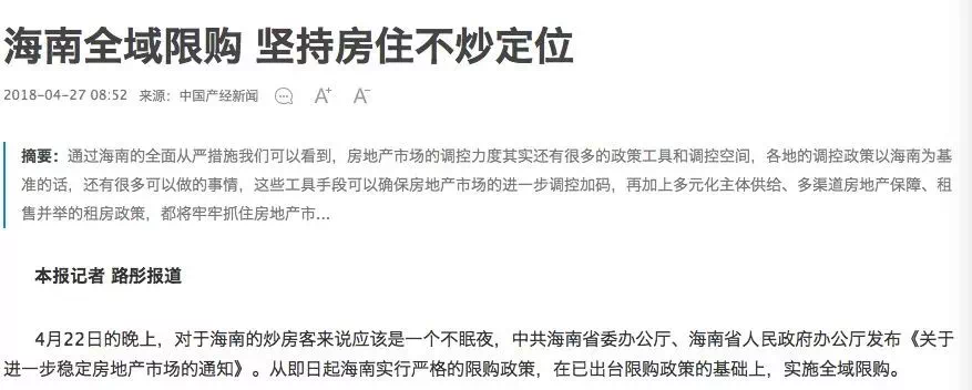 4月22日晚,中共海南省委办公厅、海南省人民政府办公厅发布《关于进一步稳定房地产市场的通知》,通知要求海南全省实行最严格的节约用地制度,实施建设用地总量和强度双控行动,确保海南建设用地总量在现有基础上不增加。