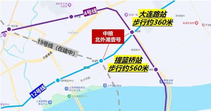 交通方面: 项目周围环绕三条地铁,步行约360米到4、12号线大连路站,步行约560米到12、19号线(在建)提篮桥站。