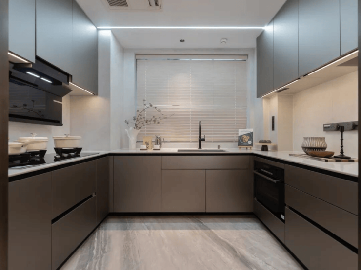 厨房采用博世厨电四件套:三眼灶台、壁挂式侧吸油烟机、15套大容量的洗碗机、大容量的蒸烤一体机。还配备日立厨房空调(具备制冷和制热功能),比市面上普通的凉霸更升一级。