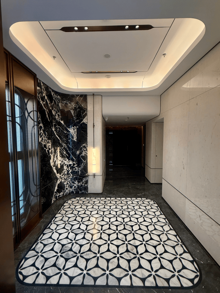 地面,皇家白玉与银镜黑石材拼镶成玉兰花般的几何图案,海派浪漫凝于足下。大面积的拜德灰石材,则赋予步履以沉稳底色。