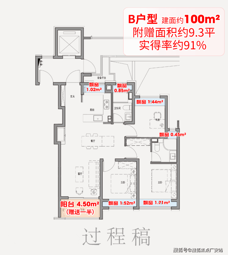 一方面,全系户型标配“全屋飘窗(全赠送)+大阳台(半赠送)”,经专业测算,百平米中间套实得率约91%,赠送面积达9.3㎡,相当于一间次卧。