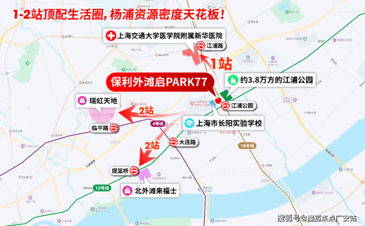 更难得的是,1-2站范围内,三甲新华医院、北外滩来福士、瑞虹商圈、江浦公园、长阳实验学校等顶配资源一应俱全。