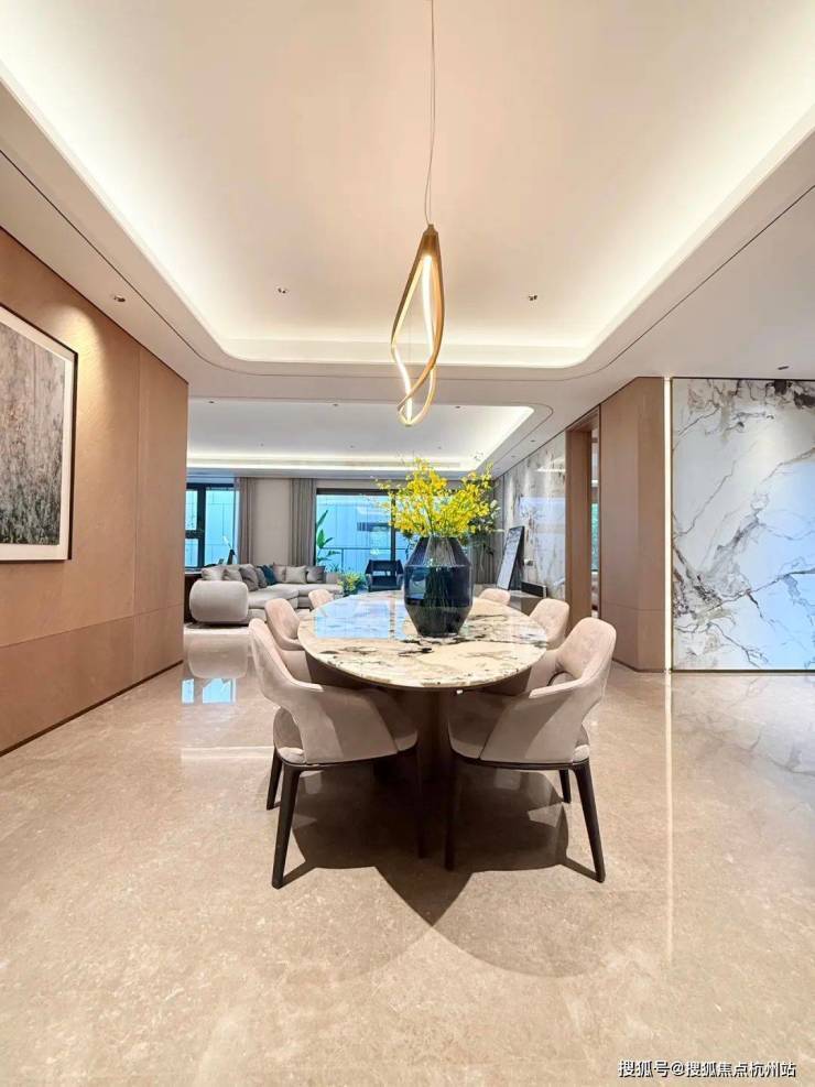 精心设计的灯光与水磨石地面,将功能性空间转化为具有五星级酒店仪式感的隐奢第一厅,让每一次回家都成为从喧嚣步入宁静的转换。