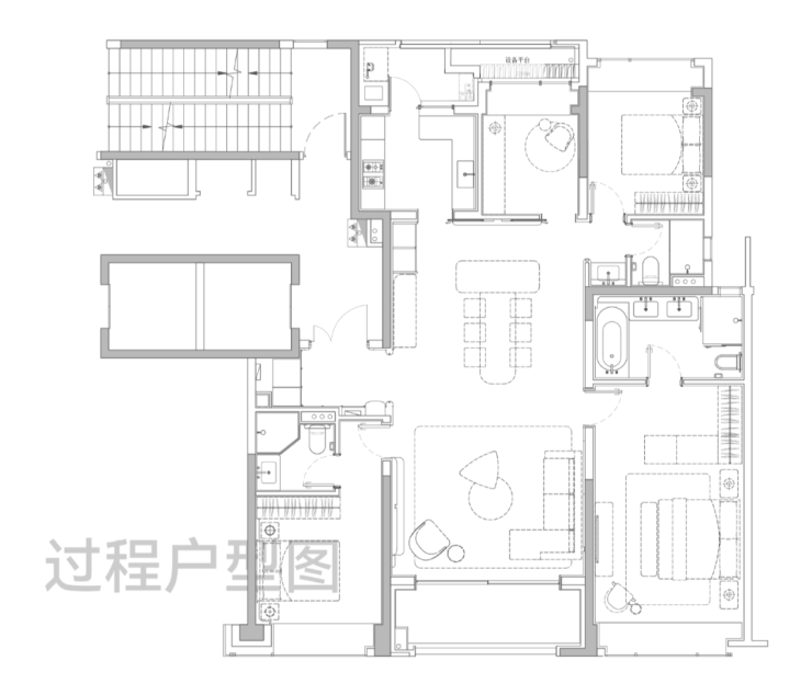 主卧配置步入式衣帽空间、双台盆+大浴缸主卫。