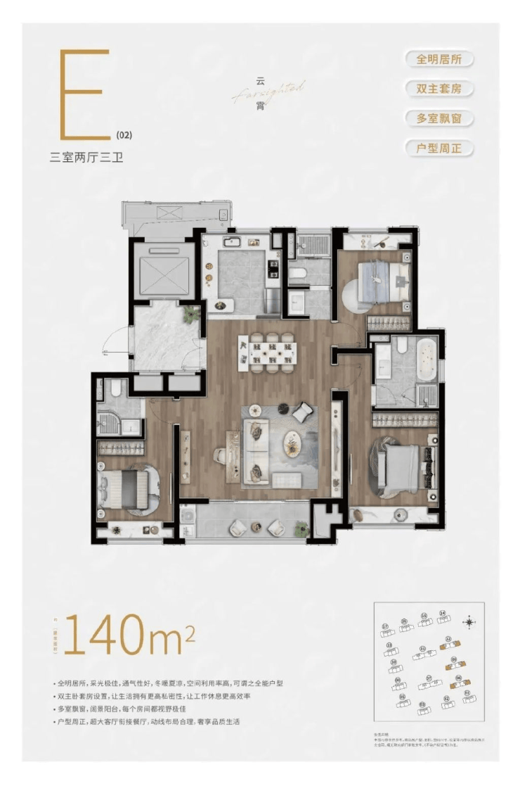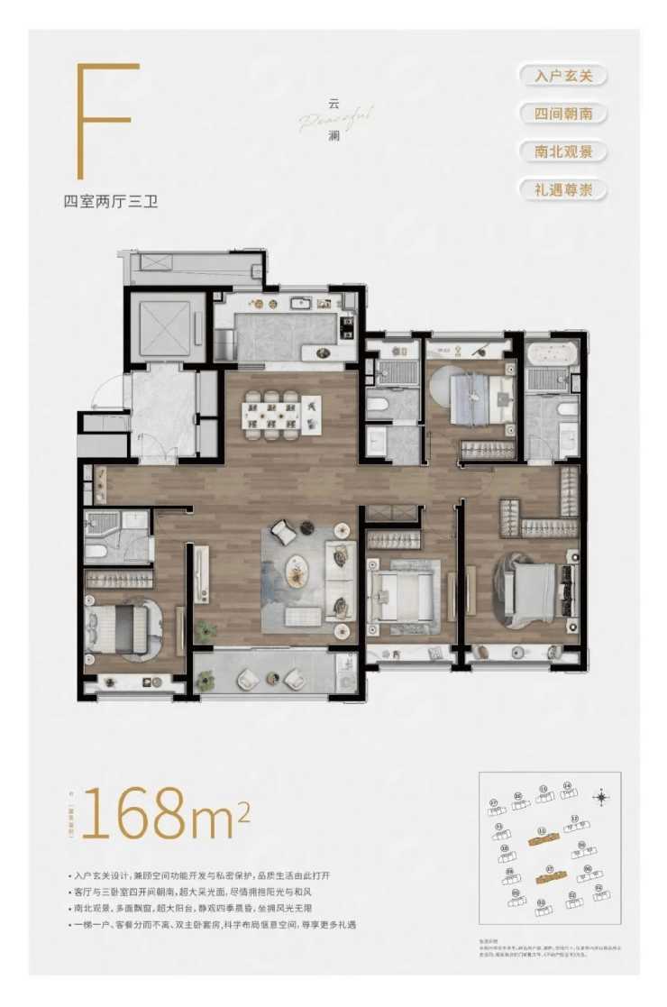168㎡四房: 四面朝南,270°转角飘窗,独立电梯厅入户,彰显改善型生活的私密与尊贵。全屋配备中央空调、地暖、新风系统,厨房与卫浴选用科勒、汉斯格雅等国际品牌,细节处尽显精装品质。