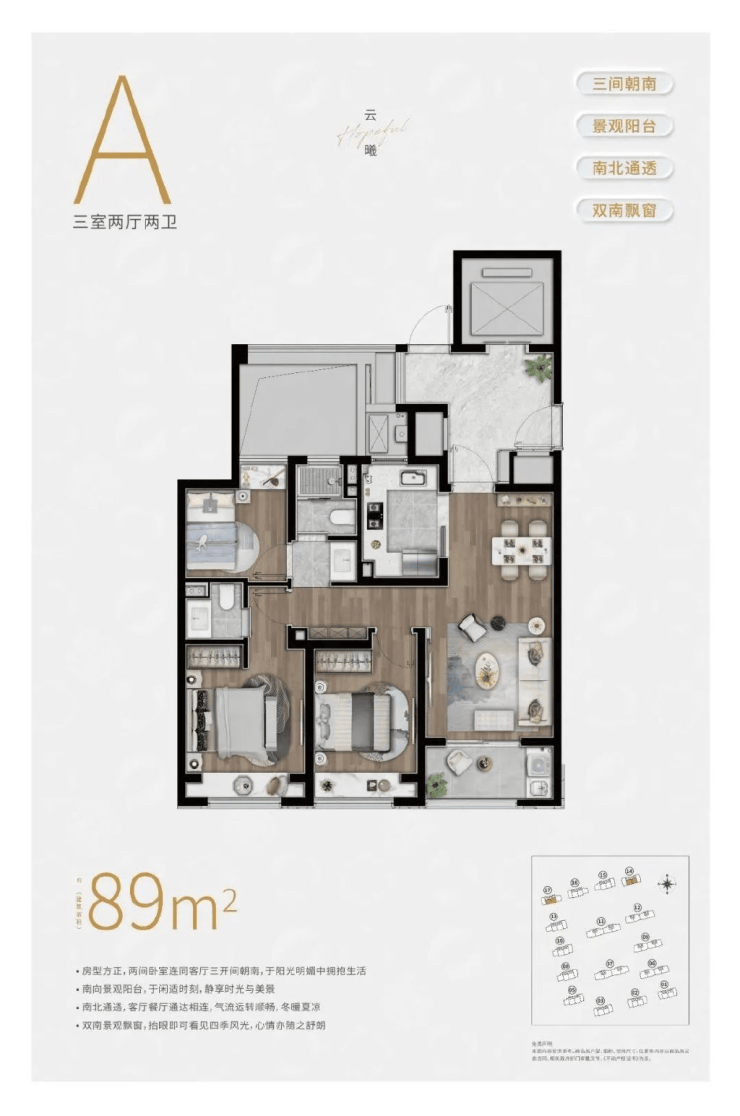89㎡三房: 南北通透,主卧套房设计,干湿分离卫浴,满足年轻家庭的功能需求。