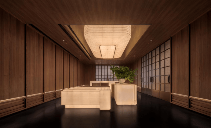 核心景观中有一座“冷翡翠玉石桥”,冷翡翠属于已停止开采的顶级奢石,通常仅在豪宅室内做把手或摆件点缀,中海选择将它满铺整桥,桥面弧形纯手工打磨,单桥价值超百万元。会所内部,吧台采用皇家白玉整石打造;架空层墙面大面积使用定制木饰面,触感温润,细节收口严丝合缝。从地面到墙面,从室外到室内,每一处都指向同一个标准:顶奢酒店化。