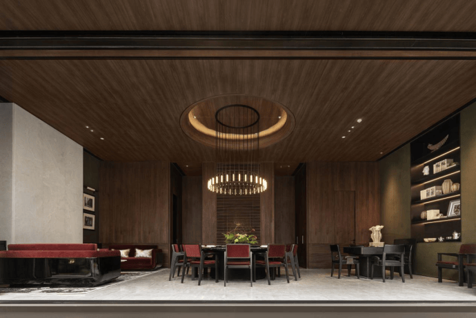 约2000㎡会所配置阳光前厅、玉石吧台、顶级健身房、水境森林下沉庭院、半标无边泳池、私宴厅、茶室与LOUNGE洽谈区。高奢酒店同款架空层将室内外景观无缝衔接,让社区公共空间真正成为业主生活半径的自然延伸。