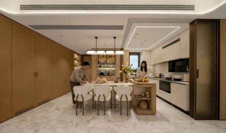 厨房与客餐厅之间没有封闭隔断,这种设计不仅拉大了视觉尺度,更让你在做羹汤时,能与客厅里的家人随时互动,打破了原本厨房的”孤独感”,赋予更多情感交流。