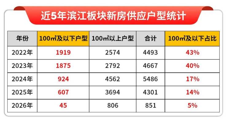 我统计了近5年滨江板块供应新房的户型面积,100㎡及以下的小户型肉眼可见的萎缩,今年整体占比只有5%,按这个缩减速度绝版是早晚的事情。