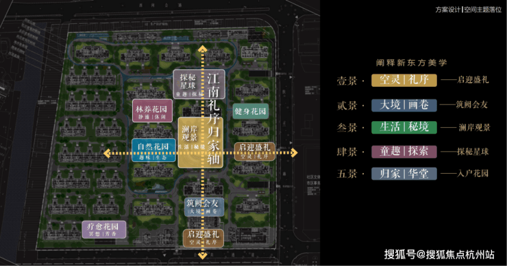 以江南人文精神为源点,打造两轴一环五进空间,江南礼序归家轴串联启迎盛礼、筑阙会友、归家华堂等5重礼制,尊崇归家;健康运动轴以24小时跑道为社区活力生活环,串联儿童乐园、长者康养、疗愈花园等10大生活场景,营造全龄全时的江南诗意生活。