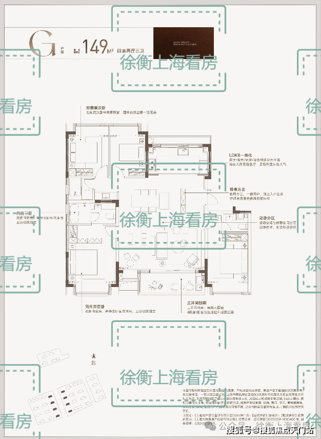 建面约149㎡四房两厅三卫: