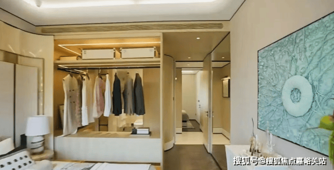 同时项目首创的“艺术柜体”,把艺术家陈亮的“大山水”作品镶嵌在橱柜门把手上;主卧背景墙更是定制款画作与高级木饰面的巧妙拼接