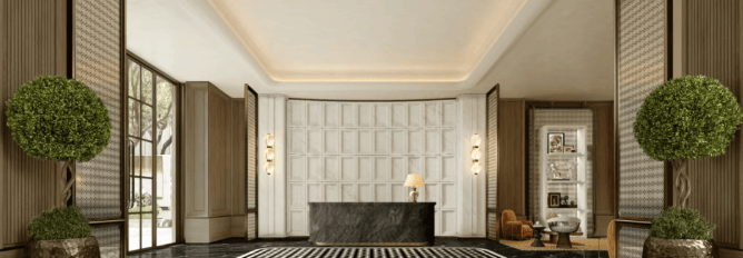 此外,相较于常规顶豪中奢石的简单铺贴,绿城黄浦ONE注重石材的艺术化设计——通过精心设计的拼花设计与错落有致的造型组合,赋予石材墙面艺术表现力;