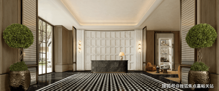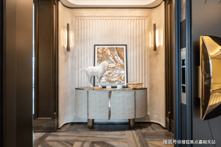 例如入户玄关铺设有“石材皇后”鱼肚印象,这种级别的奢石在很多顶豪项目中通常仅作局部镶嵌