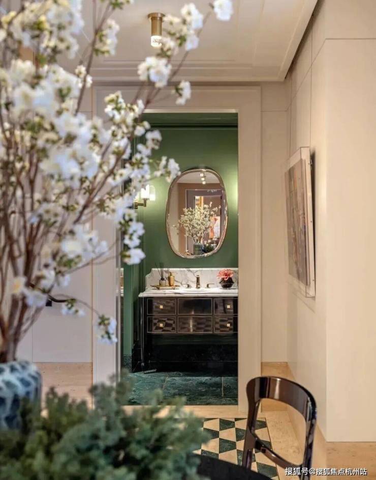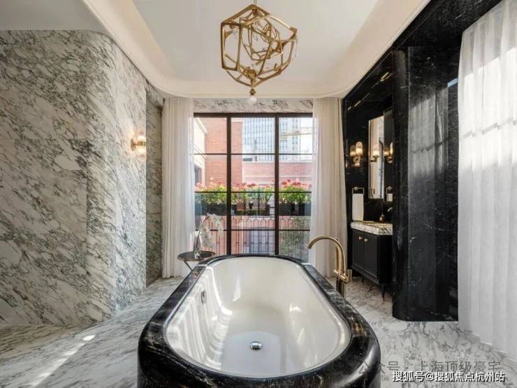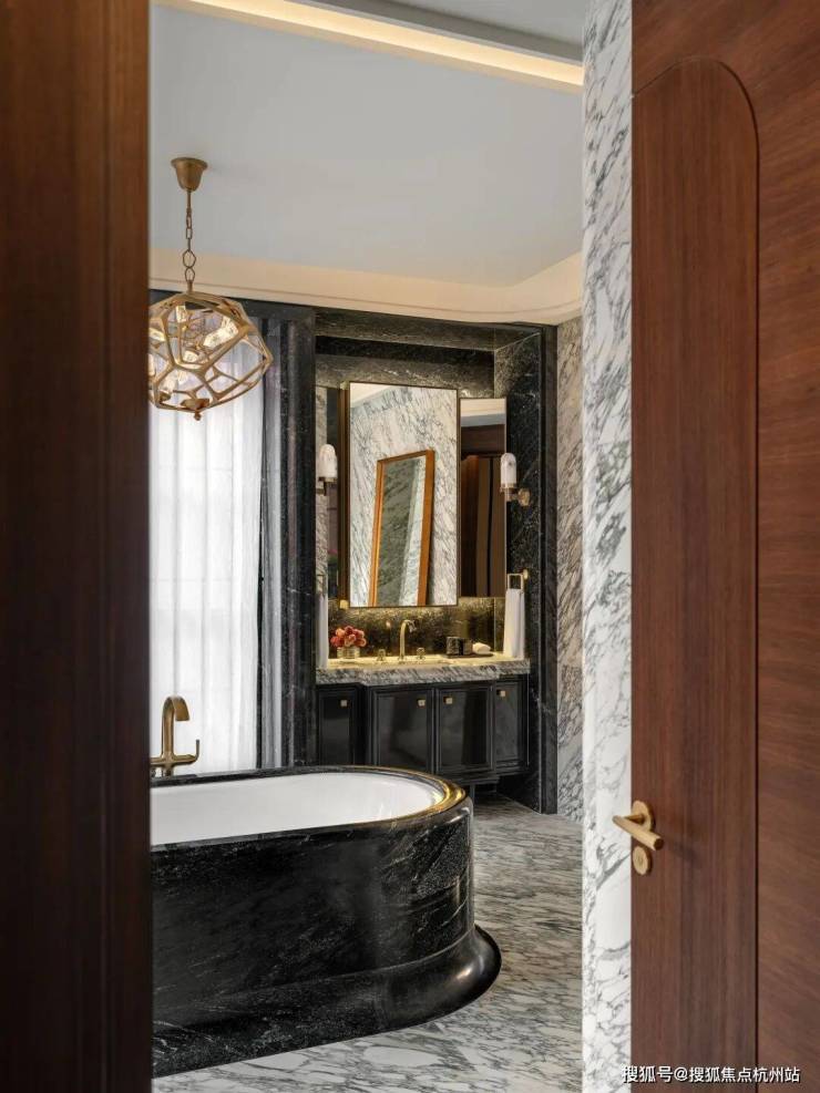 深铜色的栏杆和扶手融合传统与现代语汇,演变出一种当代型态,与现代白色洞石相映成趣,营造出优雅纯粹的意境。