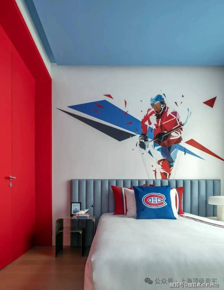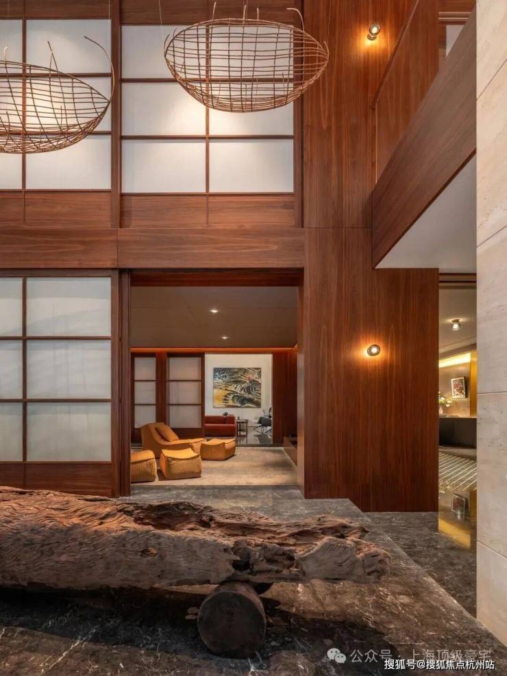 在“木屋”后方,是一个墙面和天花板都覆盖金箔的“水吧”。在这里,我们重新引入了一些当代西方设计语言——大理石地面图案、蛋形吧台和墙面护板细节。这些元素与醒目的红色高光烤漆柜相互平衡。