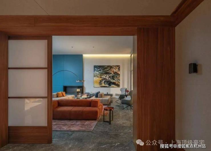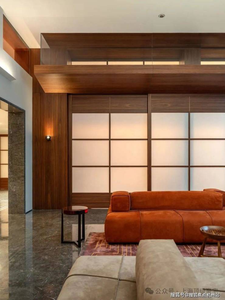 在客厅中,两个展示架巧妙地将空间分隔成主客厅区和休闲室,营造出一个与建筑尺度交相辉映的层次空间。