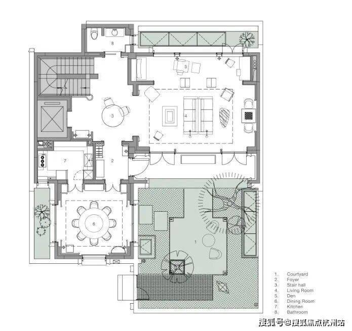 入户体验始于私家庭院。在高密度的城市环境中,庭院为住宅提供了一处解压之地,一缕新鲜空气。因此,在平面布局上,我们将所有重要空间布置在庭院周边,以充分利用庭院空间。