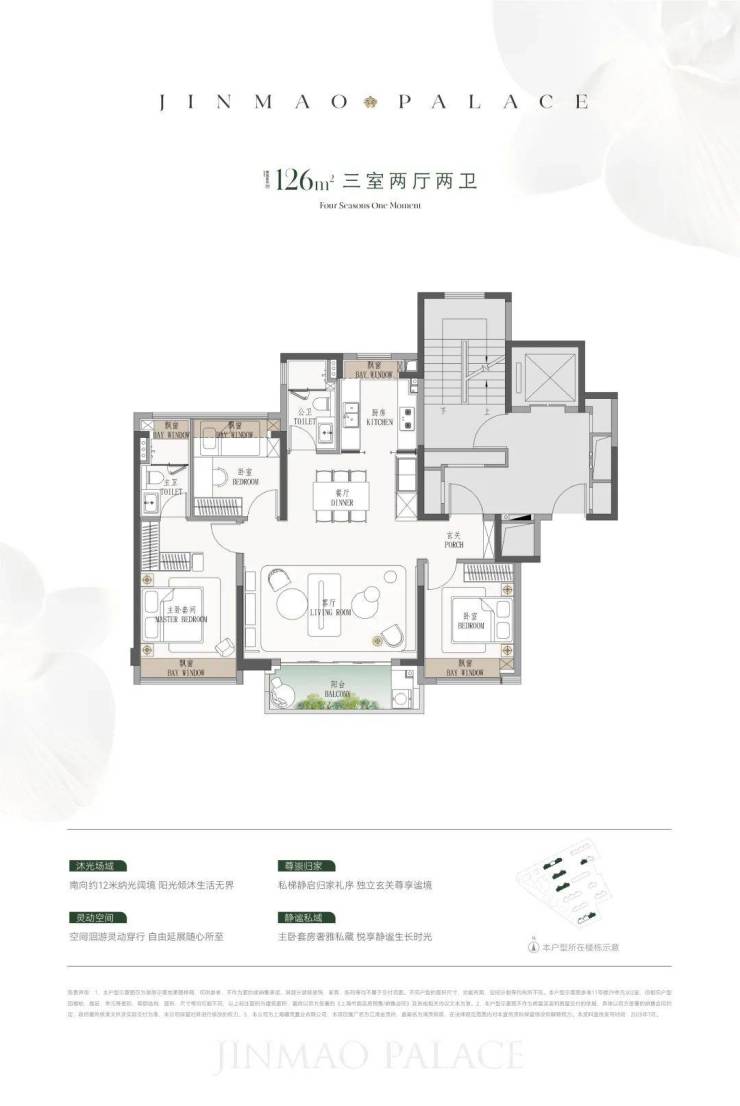 建面约126㎡横厅三房,堪称一步到位的顶奢三房,在整个杨浦区域内几乎无竞品。户型拥有南向三开间,总面宽约12米,其中宽厅面宽高达约5.9米,空间尺度感拉满;同时配备五飘窗,总赠送面积超7㎡。