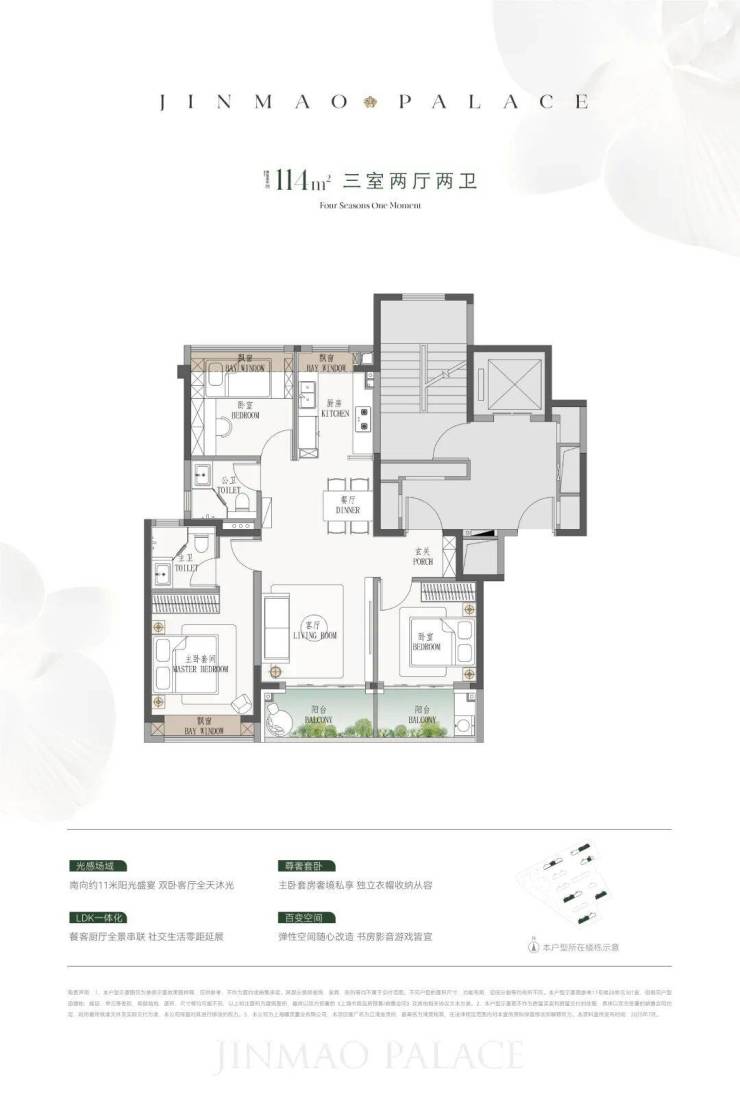 建面约144㎡四房,采用类一梯一户设计,私密性拉满,功能完善的四房布局,可承载多成员家庭的居住需求;七飘窗带来超9.9㎡赠送面积,性价比突出,要知道,同价位在杨浦区域,大多只能选择百平米左右的三房。