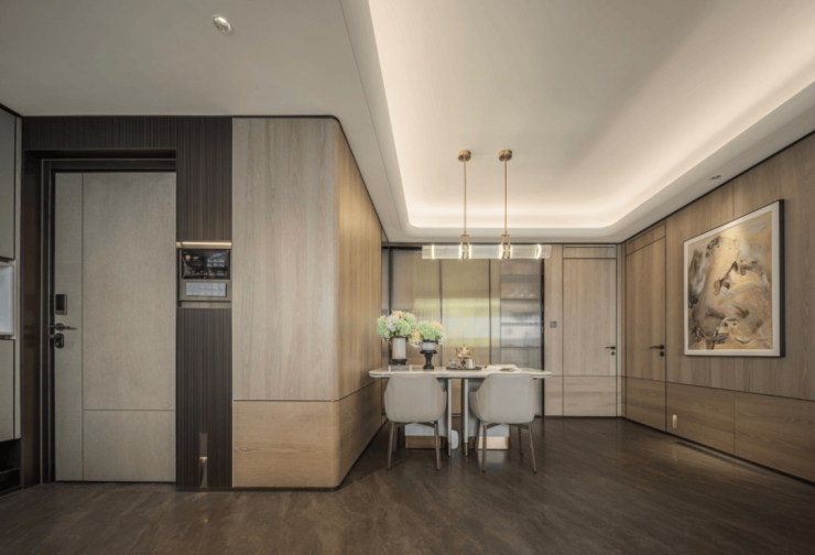 比如通过大量木饰面、隐藏门等细节设计,形成统一的设计语言,整体感强。