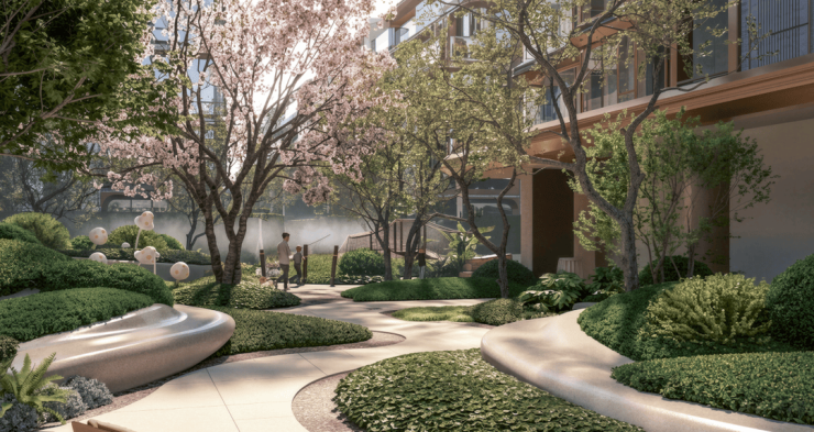 更是通过抬板的优势,设计了立体景观、垂直绿化、下沉庭院的景观,铺陈出一步一景的园林盛景。