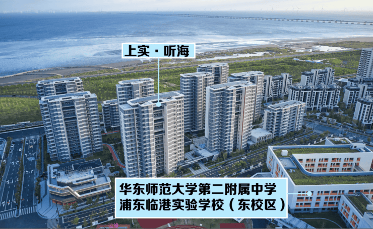 而此次落地 103 片区的华二浦东临港实验学校(东校区),是九年一贯制公办学校,实行地段对口入学。不需要民办学校高额学费,不需要摇号博运气,凭房产证和户籍/居住证即可对口入学华二九年一贯制学校,更重要的是华二东校区与上实听海仅一街之隔,步行就能到达,真正实现了“目送式上学”—— 不用早起赶校车,不用操心接送安全,家长省心,孩子也能有更多的休息时间。
