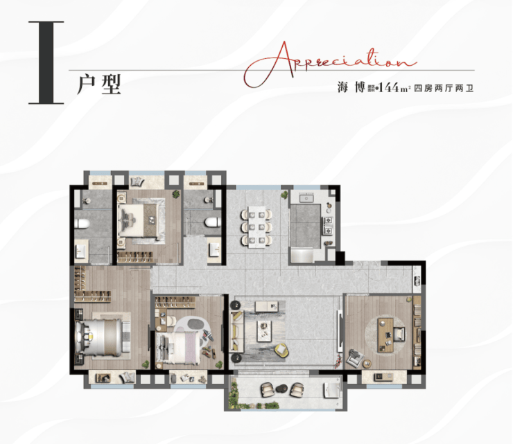 主力户型为建面约100–144㎡的精装三至四房,涵盖刚需上车与改善家庭需求