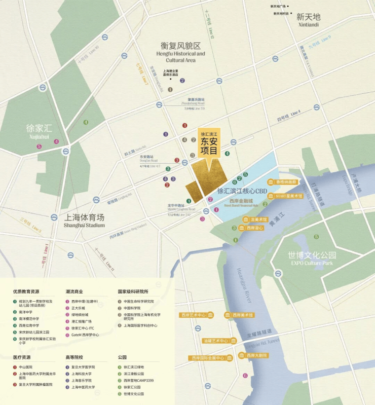 徐汇滨江东安项目【安澜上海】占位徐汇滨江核心CBD,无缝连接徐家汇、淮海路等传统核心商圈,未来项目依托枫林路片区雄厚的医疗健康产业基础,与西岸金融城(西岸中環)、西岸数字谷(均预计2027年开业)形成功能互补,打造徐汇滨江产业发展的“第三极”。(数据源于上海规划资源)