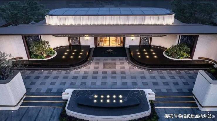 走近门庭,三重弧形石材背景墙+圆角幻彩穿孔顶,搭配中央水景,营造出星级酒店般的尊贵仪式感。