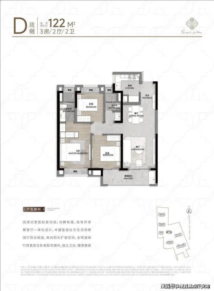 104㎡3户型特点:该户型多为楼栋的东边套,是一个观景户型。客厅连接270°阳台,视野出众。双卧朝南,阳光满溢。从次卫布局看,如果家庭人口较少,该户型还能做成双套卧。