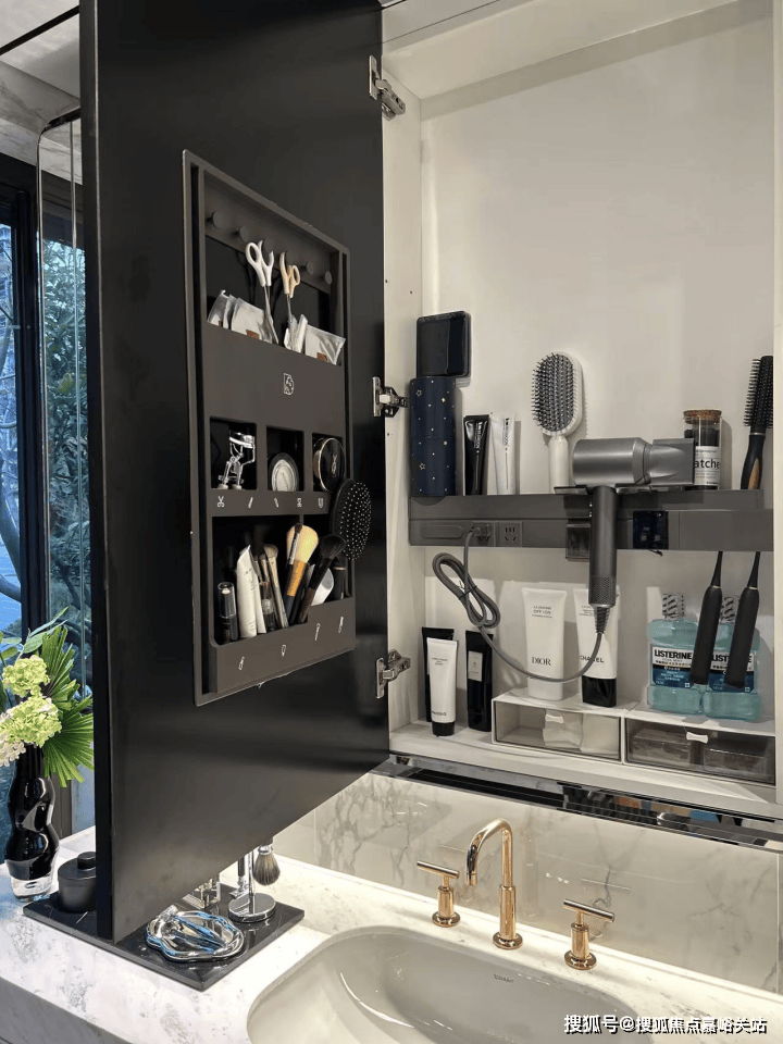 主卫的镜柜,也做双面收纳设计。主卫延伸出来的创新飘窗,可以在上面摆放各种日常用品。