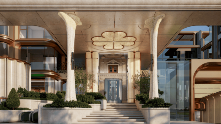 以全光幕立面打造杨浦滨江独树一帜的人居封面,并且采用了流线型香槟金铝板+大面积落地玻璃+天然石材+关键节点珐琅板点缀的顶配组合。最终实现户户270°环幕视野的成就。